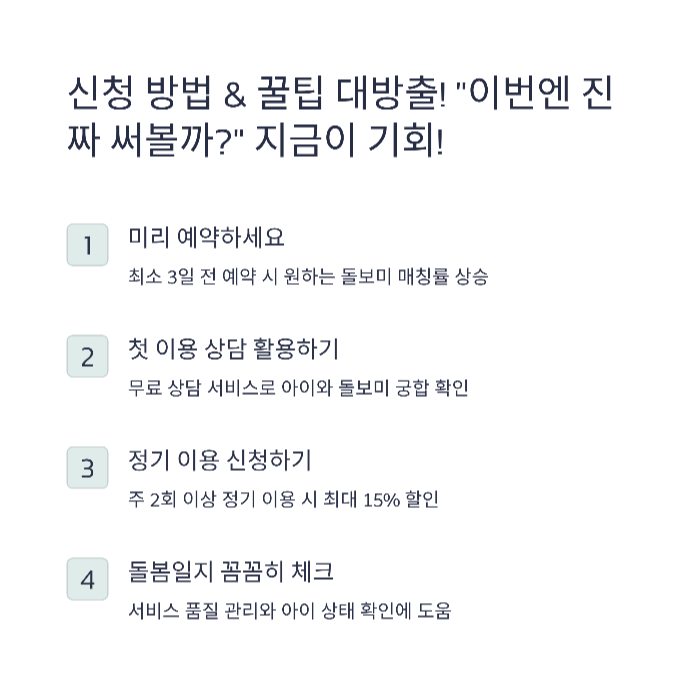 현실적인 팁을 드리자면, 가능한 빠르게 돌보미와의 의사소통을 활발히 하는 것이 만족도를 높이는 지름길입니다. 정기적인 피드백과 감사 인사도 큰 도움이 됩니다.