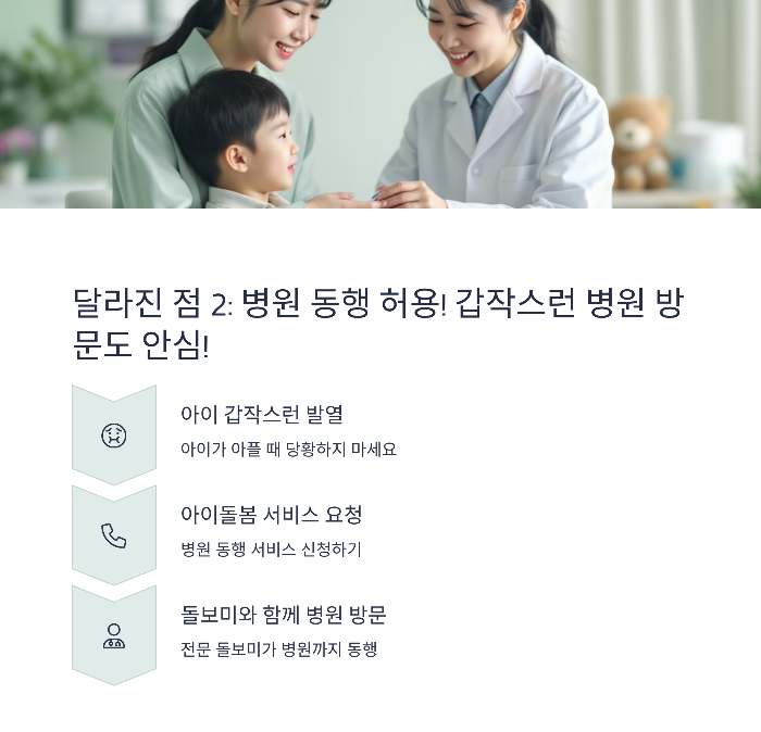 - 질병감염아동 병원 동행 허용: 돌보미가 직접 병원에 동행하거나 재가 돌봄이 가능해져 부모의 부담을 줄였습니다.