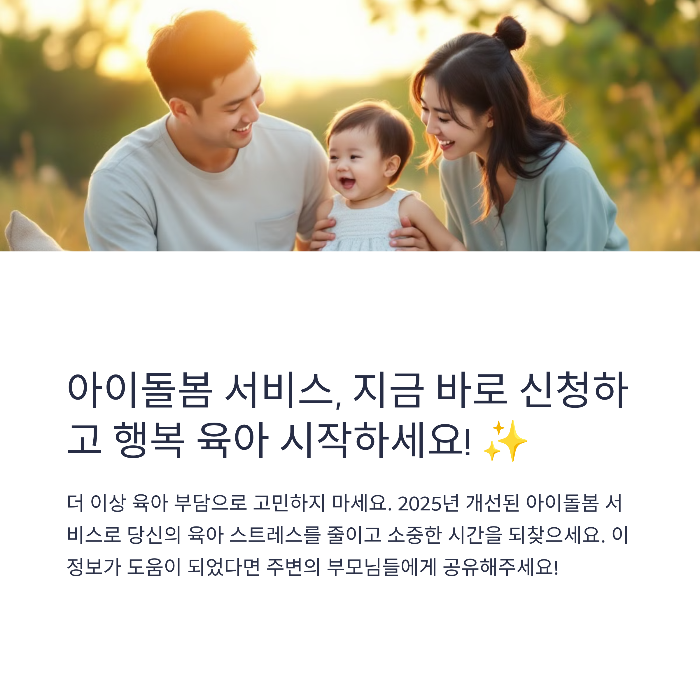 아이 키우는 일이 결코 혼자 감당해야 할 일이 아니듯, 아이돌봄 서비스는 부모님의 육아 부담을 실질적으로 덜어주는 든든한 제도입니다. 2025년 변화된 지원 기준과 신청 방법을 잘 활용한다면, 우리 아이에게는 안정된 돌봄 환경을, 부모에게는 더 많은 여유와 회복의 시간을 줄 수 있습니다. 복잡해 보이지만 하나씩 차근차근 준비하면 어렵지 않게 이용할 수 있으니, 이번 기회에 꼭 확인해보시길 바랍니다.